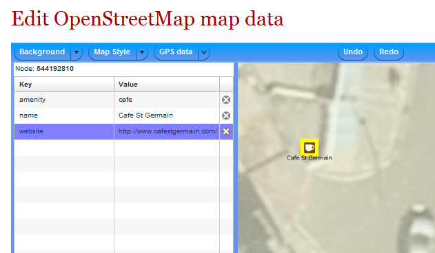 Or perhaps no-one's added a location's website yet? Click on the 'add it' link in the popup shown above. Follow the link, click on the icon, click on 'Advanced' and then enter 'website' on the left and the URL on the right, and click Save. You'll need to create an OpenStreetMap account if you don't have one already.
