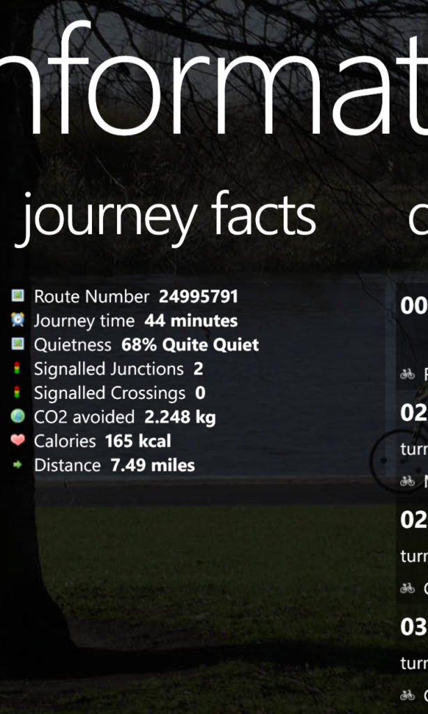 For the first release we have included cycle routing, navigation waypoints, routing information (such as time, distance, calories etc), points of interest and step by step navigation using the Nokia Maps 3D view. In time we will add additional CycleStreets functionality such as Photomap, OpenStreetMap overlays, leisure routing and we also plan to add voice guided navigation.